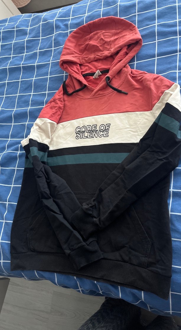 Uzun kollu, kapüşonlu ve fitted kesim erkek sweatshirt. Kırmızı, krem ve siyah renk blokları ve "CODE OF SILENCE" baskısı bulunur. Yumuşak kumaştan üretilmiştir.