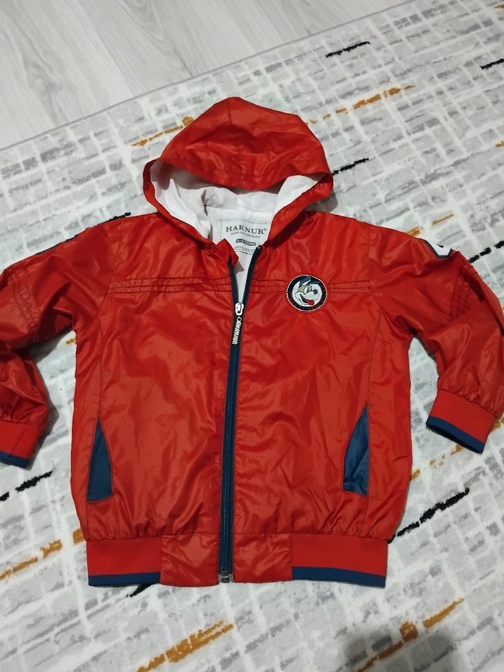 Kırmızı kapüşonlu, fermuarlı erkek çocuk ceketi, renkli baskılarla hareketlenmiş. Yumuşak ve sıcak kumaştan, dar kesim ve sokak stili için uygun.