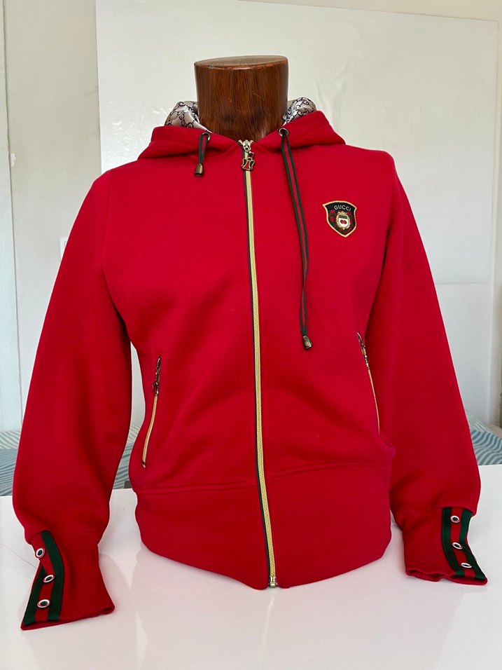 Kapüşonlu, uzun kollu, fermuarlı kırmızı kadın ceket. Renkli baskılı detaylara ve fermuarlı ceplere sahip, günlük sokak stili için uygun.