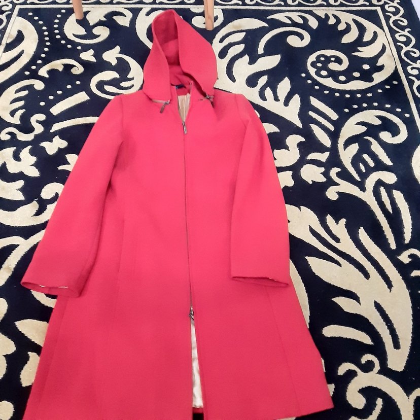Kapüşonlu, önü fermuarlı kırmızı kaban. Düz dokulu ve uzun kollu, serin havalar için uygundur.