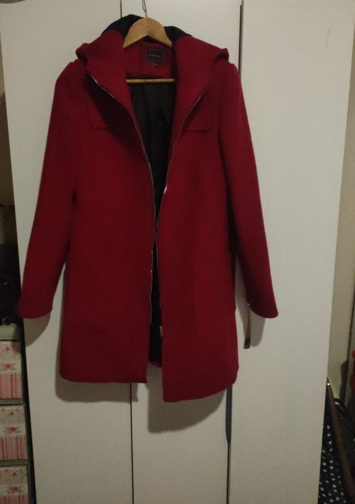 Kapüşonlu, ön fermuarlı Koton marka kırmızı kaban. Uzun kollu ve yan cepli, kaşe,çok sıcak tutar. En:50 Boy:48 Kol uzunluk: 60 cm. 38 beden