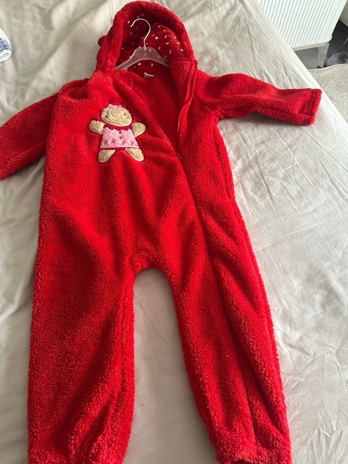 Kapüşonlu ve örgü dokulu kırmızı kız bebek tulumu, önünde sevimli ayıcık aplikesi bulunur. Yumuşak ve sıcak kumaştan yapılmıştır.1 kere giyilmiştir. 3-4 yaş