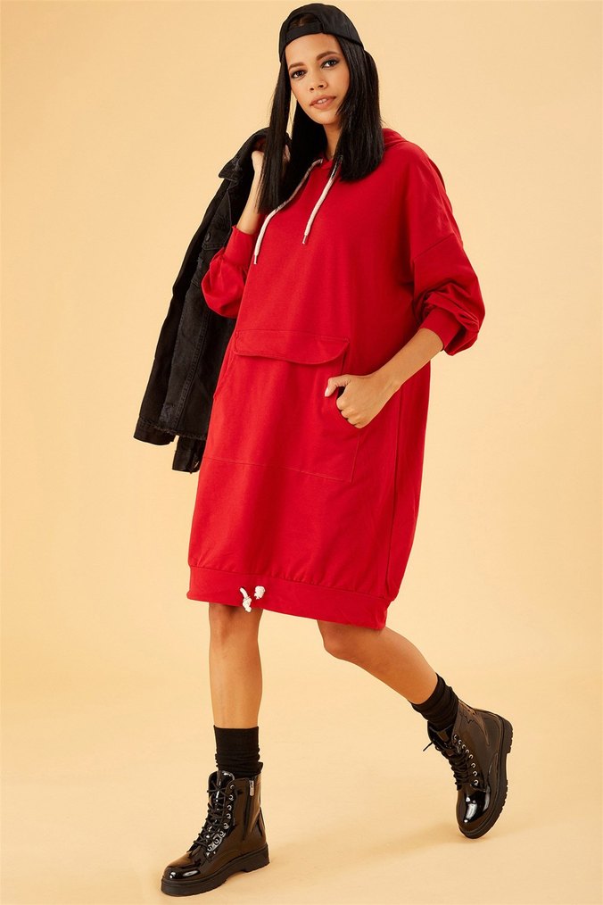 Kapüşonlu Kırmızı Midi Rahat Elbise