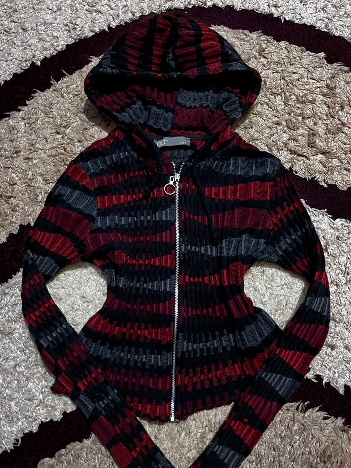 Kapüşonlu Kırmızı Siyah Vintage Hırka