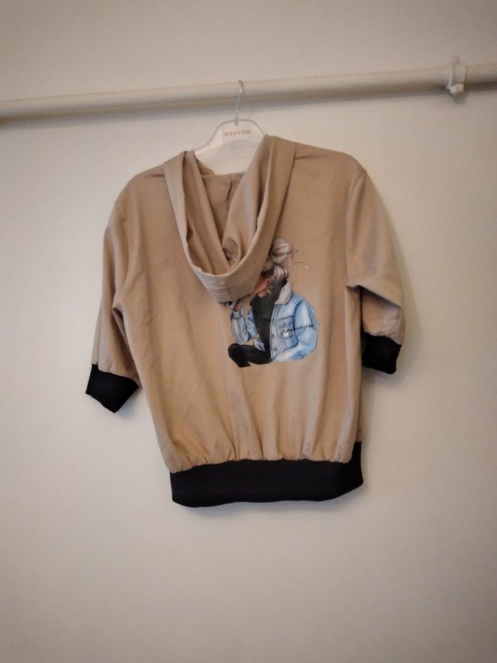 kısa kollu, bol kesim bej . Baskılı tasarım ve siyah ribana manşet ile etek ucu. Yumuşak kumaştan, günlük kullanıma uygun.
