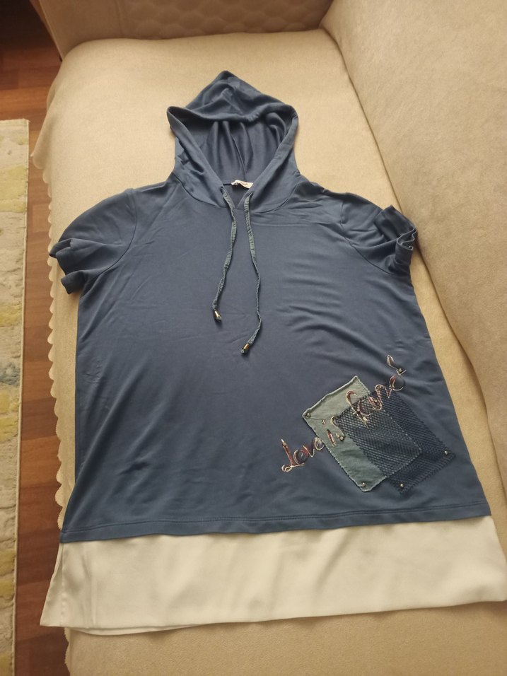 petrol mavi kapüşonlu sweatshirt, kısa kollu ve bol kesim. Baskılı detayları ve bulunur, günlük rahat kullanıma uygun.