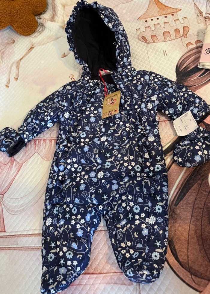 Koyu mavi kapüşonlu kız bebek tulumu, baskılı desene ve fermuarlı kapanışa sahiptir. Eldivenleriyle birlikte gelir, soğuk havalar için uygundur. ❄️1-3 ay