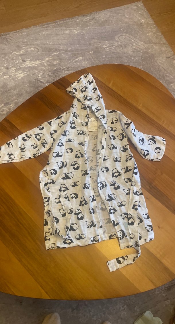 Kapüşonlu, yumuşak ve sıcak kumaştan yapılmış kız çocuk bornozu, gri beyaz panda desenlidir. Belden bağlama kemeri vardır.