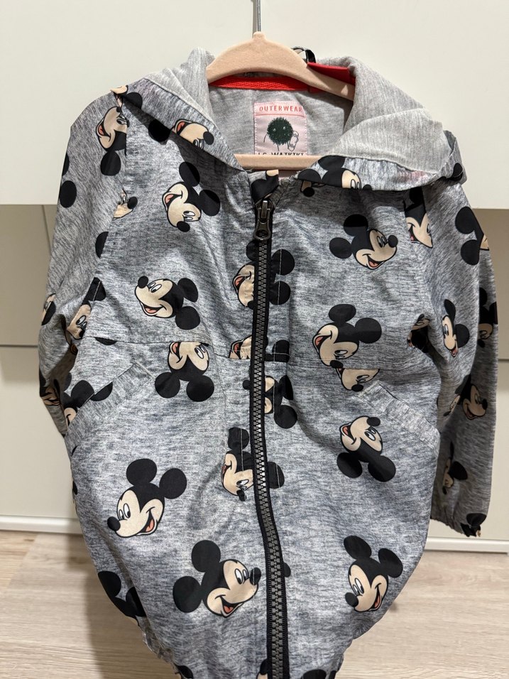 Kapüşonlu, fermuarlı ve baskılı Mickey Mouse desenli, gri renkli kız çocuk ceket, temiz lekesiz defosuz