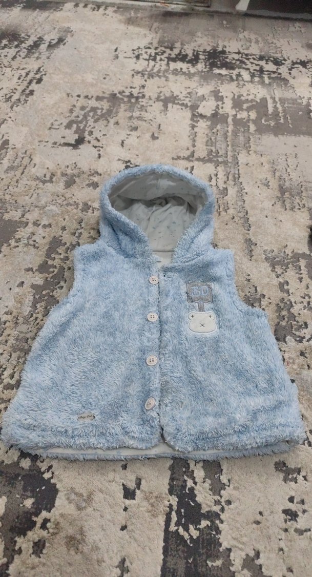 Kapüşonlu, peluş kumaştan yapılmış, nakış detaylı mavi kız çocuk yeleği. Düğmeli ve bol kesimdir, rahat sokak tarzı için uygundur.