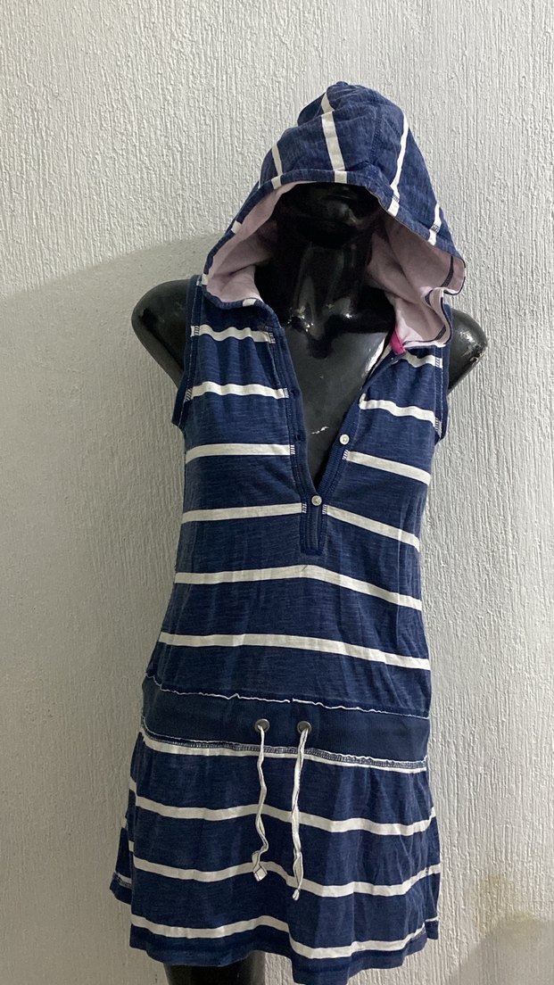 Kapüşonlu, kolsuz, beyaz çizgili lacivert elbise. Derin V yaka düğmeli, belden ipli, yumuşak sentetik kumaştan. Günlük sokak stili için uygun. Çocuk reyonundan almıştım xs ve s bedene uygundur