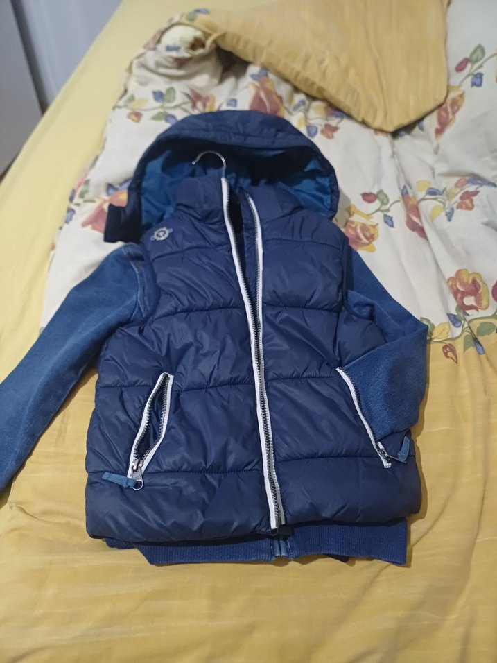Kapüşonlu, fermuarlı cepleri olan, yumuşak ve sıcak kumaştan yapılmış koyu mavi, erkek çocuklar için yelek mont. ici polarlı kapşonu çıt çıtlı çıkarılabilir.