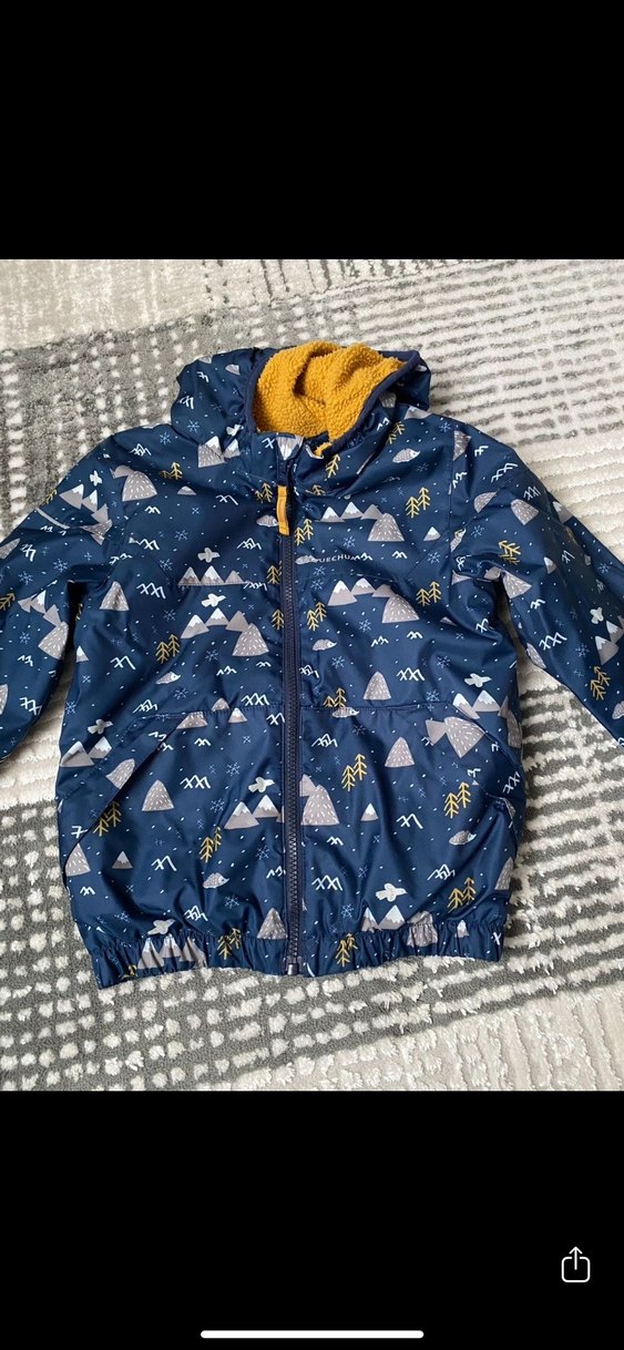 Kapüşonlu, fermuarlı ve baskılı desenli koyu mavi erkek yağmurluğu, rahat kesim ve yumuşak fleece astarlı. Sıfırdan farksız çok az kullanıldı