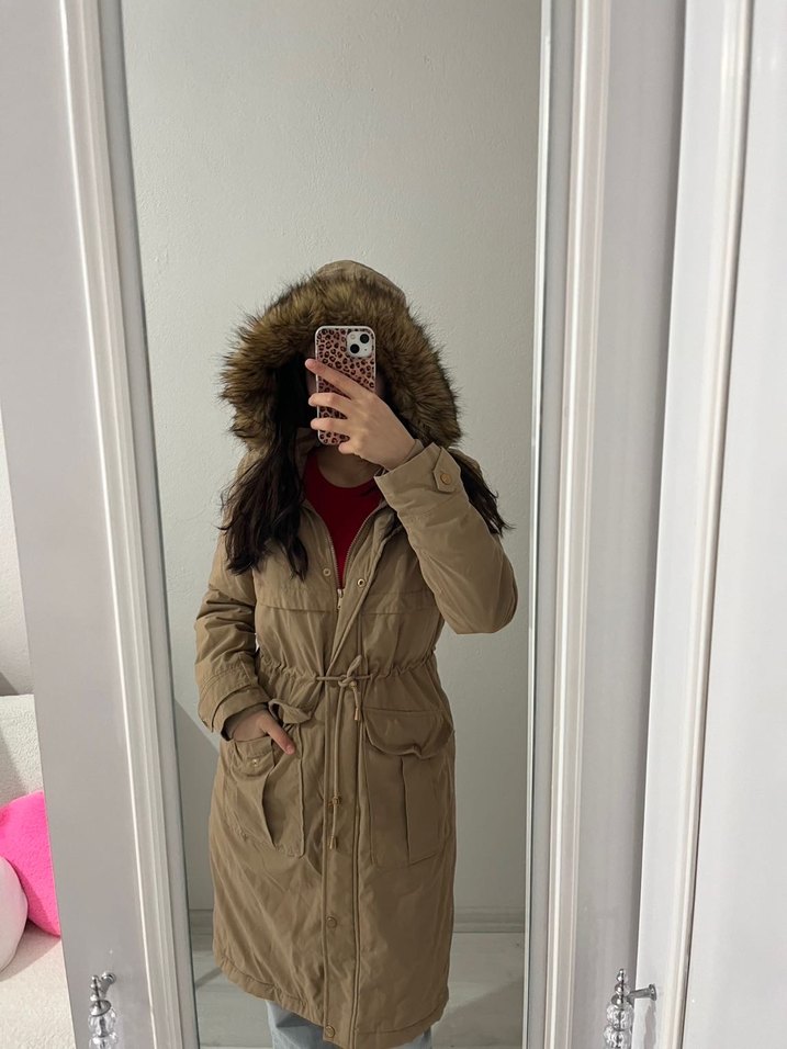 Kapüşonlu Krem Kadın Uzun mont koltuk altı sökük sadece