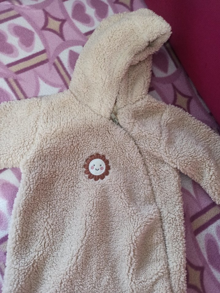 Kapüşonlu, kürklü ve nakışlı pastel kahverengi desenli bebek kız tulumu, soğuk havalar için sıcak tutar. ❄️