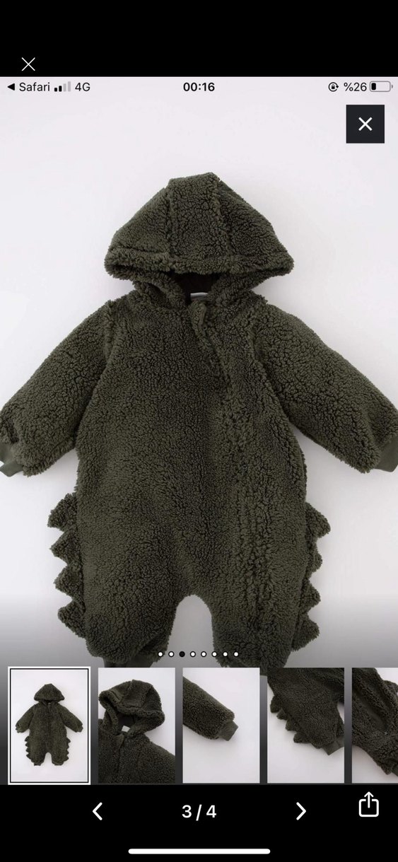 Kapüşonlu, kürklü detaylı, düz gri renkte, yumuşak ve sıcak kumaştan yapılmış bebek tulumu. Normcore tarzda rahat bir seçim.