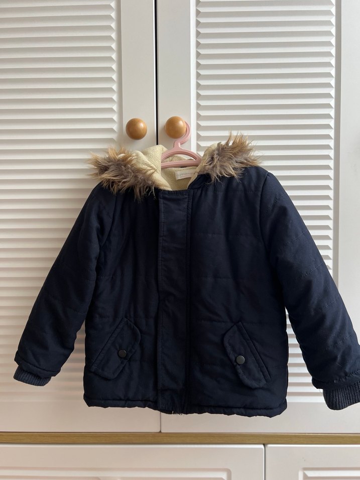 Kapüşonlu ve kürk detaylı, yumuşak ve sıcak kumaştan yapılmış erkek çocuk kabanı. Koyu lacivert renkte, sade ve desen içermeyen tasarım sunar.