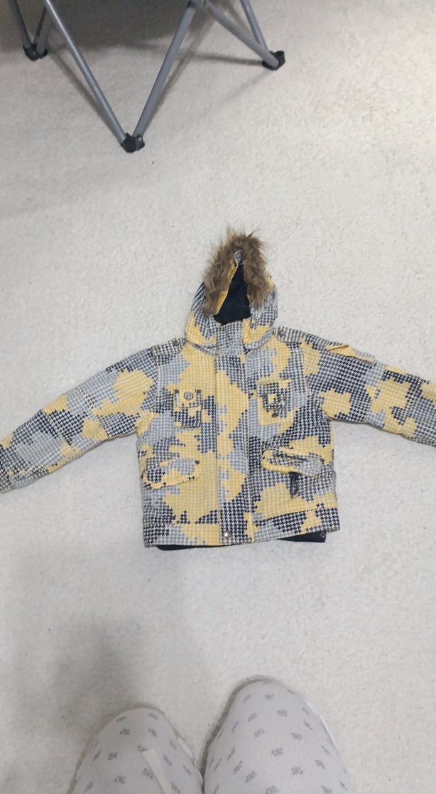 Kapüşonlu, kürklü detaylı, sarı-gri kamuflaj desenli, erkek çocuk kar montudur. Yumuşak ve sıcak kumaştan, sokak tarzına uygundur.