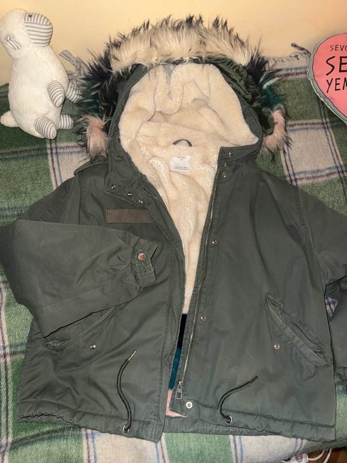 Bu koyu yeşil kadın ceketi, kamuflaj desenli ve kürklü kapüşonludur. Bol kesim, uzun kollu ve yumuşak, sıcak tutan fleece astarlıdır.