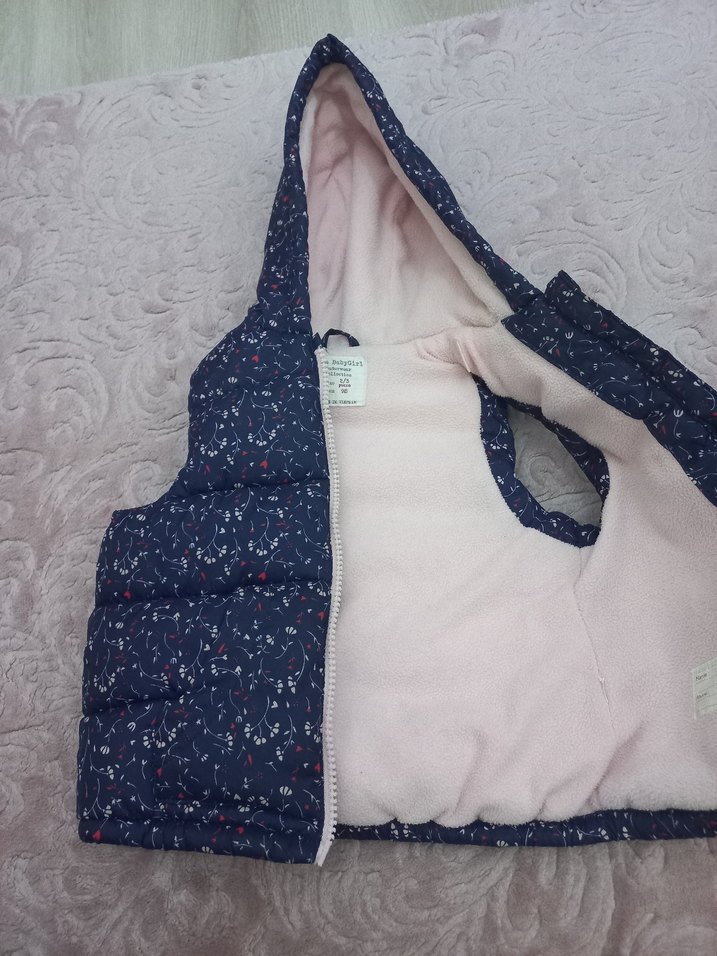 Kızlar için kapüşonlu, kürklü detaylı, V yakalı, baskılı ve fitted kesimli mavi-gri yelek. Rahat sokak stili için uygundur. Tertemiz hiç kusuru yok 2 -3 yas