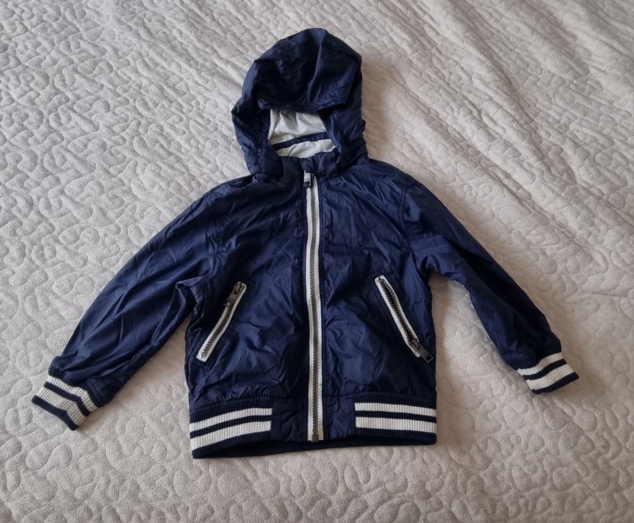 Kapüşonlu, fermuarlı cepleri olan, lacivert renkli ve dar kesim erkek çocuk montu.