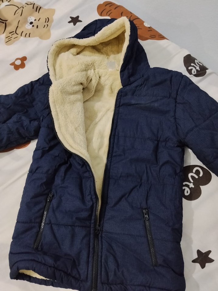 Kapüşonlu, fermuarlı ve içi yumuşak kumaşlı mavi erkek çocuk mont. Sokak stiline uygun, dar kesimdir.