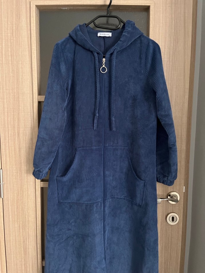 Lacivert kadife dokulu kapüşonlu kap, ön fermuar ve ceplerle rahat ve sade bir kullanım sunar. Uzun kolludur.