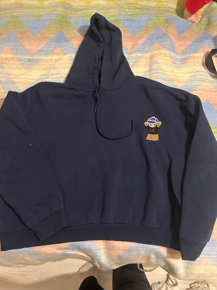 Lacivert kapüşonlu kadın sweatshirt, uzun kollu ve rahat kesimdir. Yumuşak ve sıcak kumaştan üretilmiş, baskılı detaylara sahiptir. Günlük kullanıma uygundur.