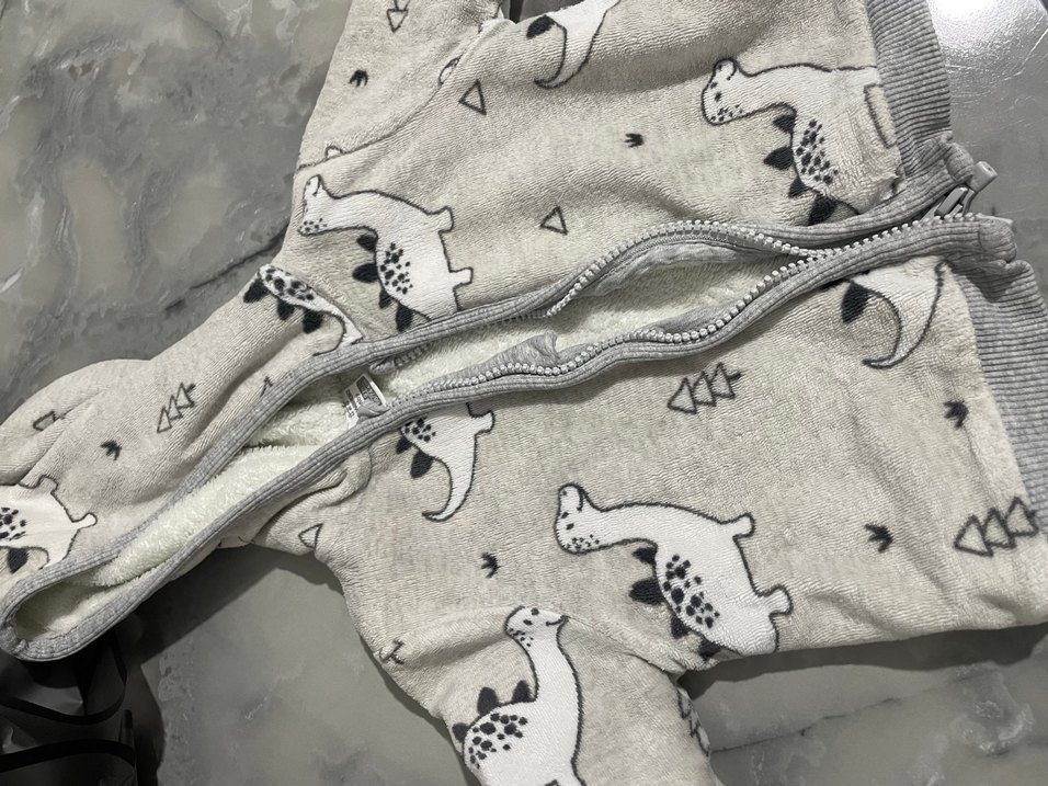 Kapüşonlu, uzun kollu ve fermuarlı gri bebek ceket. Yumuşak ve sıcak kumaştan, baskılı desenli, sokak stiline uygun.