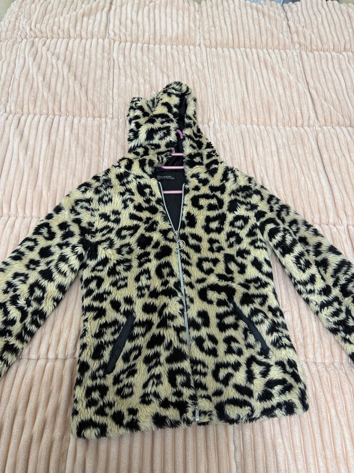 Kapüşonlu, uzun kollu ve leopar desenli bu kadın mont, yumuşak kürk detaylarıyla rahat ve şık bir sokak stili sunar.