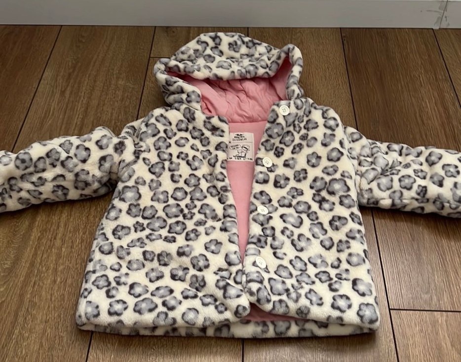 Kapüşonlu, leopar desenli gri kız çocuk ceketi, yumuşak ve sıcak kumaştan, kürk detaylıdır.