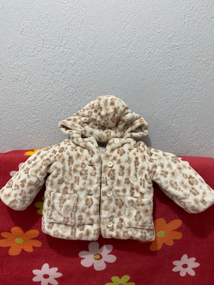 Kapüşonlu, leopar desenli ve yumuşak, sıcak dokulu kız çocuk montu. Kürk detaylı ve ön ceplidir, rahat sokak stili için uygundur.