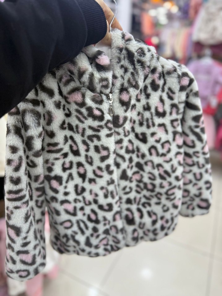 Gri leopar desenli, kapüşonlu, peluş kumaştan yapılmış bol kesim kız çocuk montu. Tüylü detaylarıyla trend sokak stili için uygundur. 5 yaş