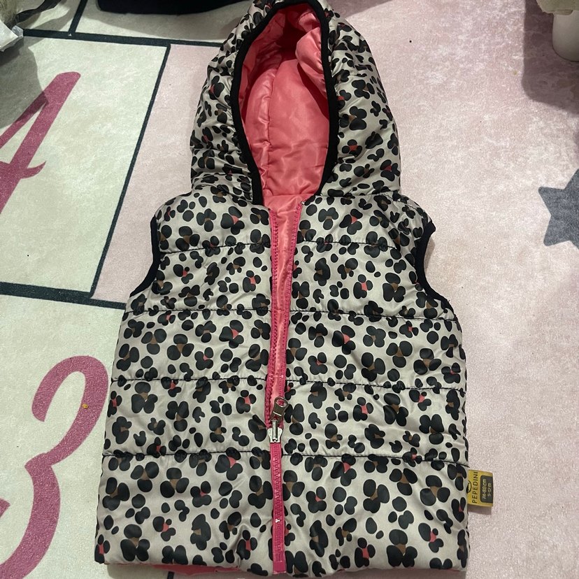 Kapüşonlu, leopar desenli, fitted kesim kız yeleği. Yumuşak, kürk detaylı astarı ve pembe iç kumaşı vardır. Sokak tarzına uygun. Ikılı fıyat