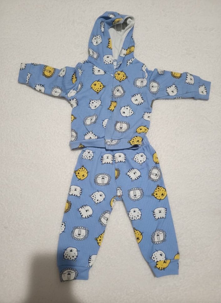 Kapüşonlu uzun kollu üst ve pantolondan oluşan mavi, renkli leopar desenli bebek takımı. Örgü dokusu yumuşak ve sıcaktır. 3 6 ay arası 80 cm bebeğe kadar uygun