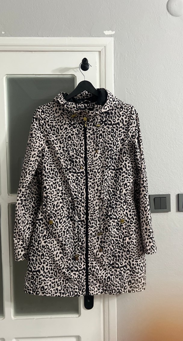 , kapüşonlu ve uzun kollu, leopar desenli yağmurluk . Orta boy fermuarlıdır ,bel kısmında ve şapka kısmında büzgüler var o şekilde de kullanabilirsiniz, hiçbir sıkıntısı yoktur zarif gold detayları vardır