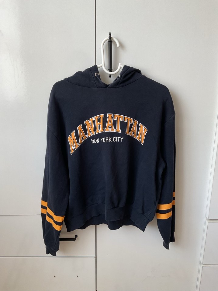 Mavi kapüşonlu sweatshirt, bol kesim ve uzun kollu, turuncu şerit detaylıdır. Önünde 'MANHATTAN NEW YORK CITY' baskısı ve örme dokusu vardır.
