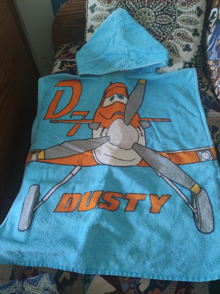 Mavi kapüşonlu erkek çocuk bornozu, renkli baskılı uçak ve "DUSTY" yazısı ile. Yumuşak, emici kumaştan üretilmiştir. ✈️