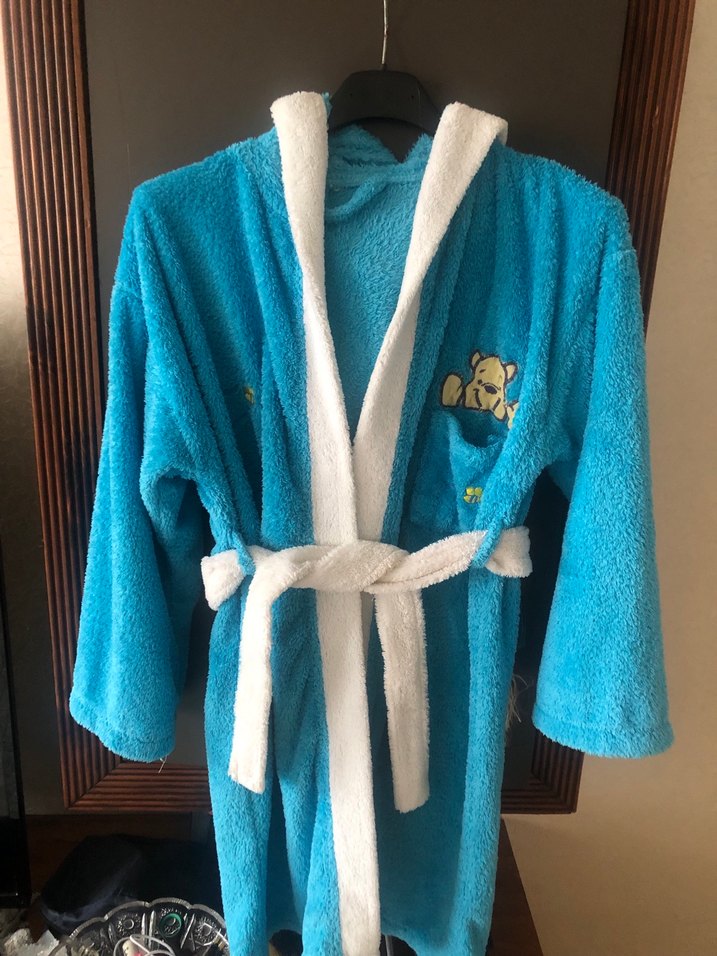 Kapüşonlu ve kemerli mavi erkek çocuk bornozunda renkli baskılar ve beyaz detaylar bulunur. Hiç bir sıkıntı yok yumuşak cık ebebek den almıştım