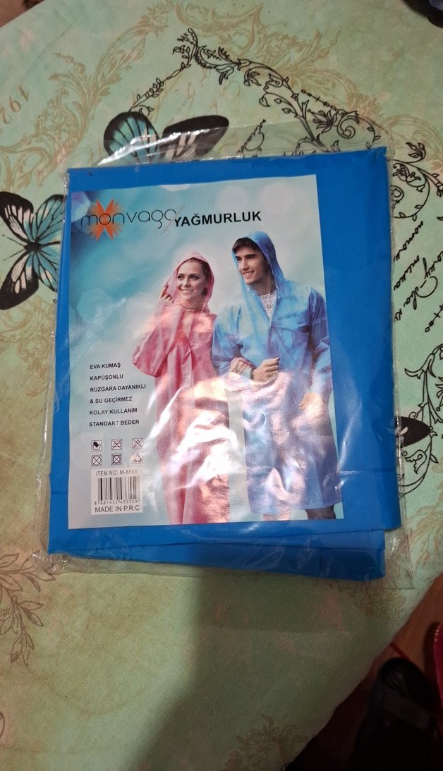 Kapüşonlu, baskılı desenli, plastik malzemeden üretilmiş bol kesim yağmurluk. Midi boy, uzun kollu, açık mavi renkte, günlük kullanım için uygundur. ️