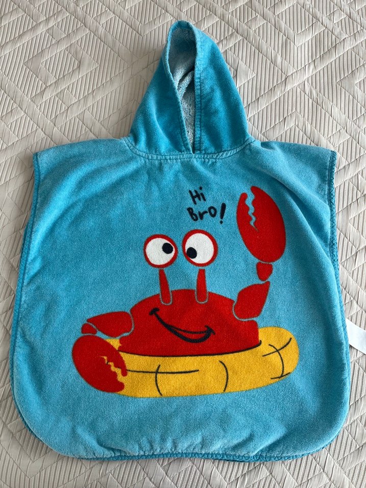 Kapüşonlu, renkli mavi çocuk bornozu, üzerinde 'Hi Bro!' yazılı sevimli yengeç baskısı bulunur. Yumuşak ve rahat bir yapıya sahiptir.