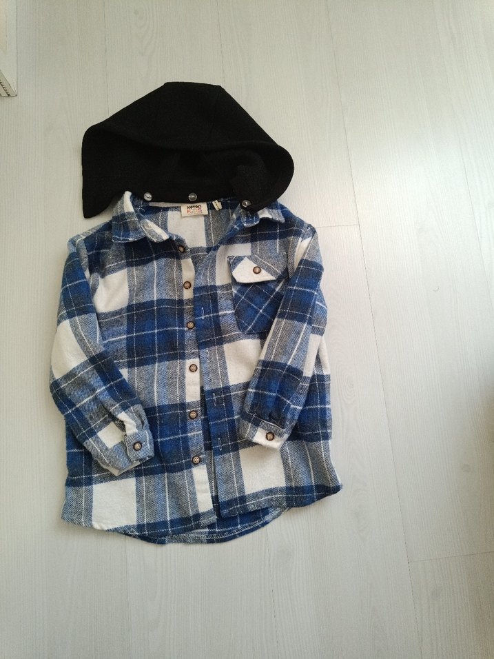 Mavi ekose desenli, kapüşonlu ve düğmeli erkek gömleği. Yumuşak ve sıcak kumaştan, uzun kollu ve bol kesim, rahat sokak stili için uygundur.