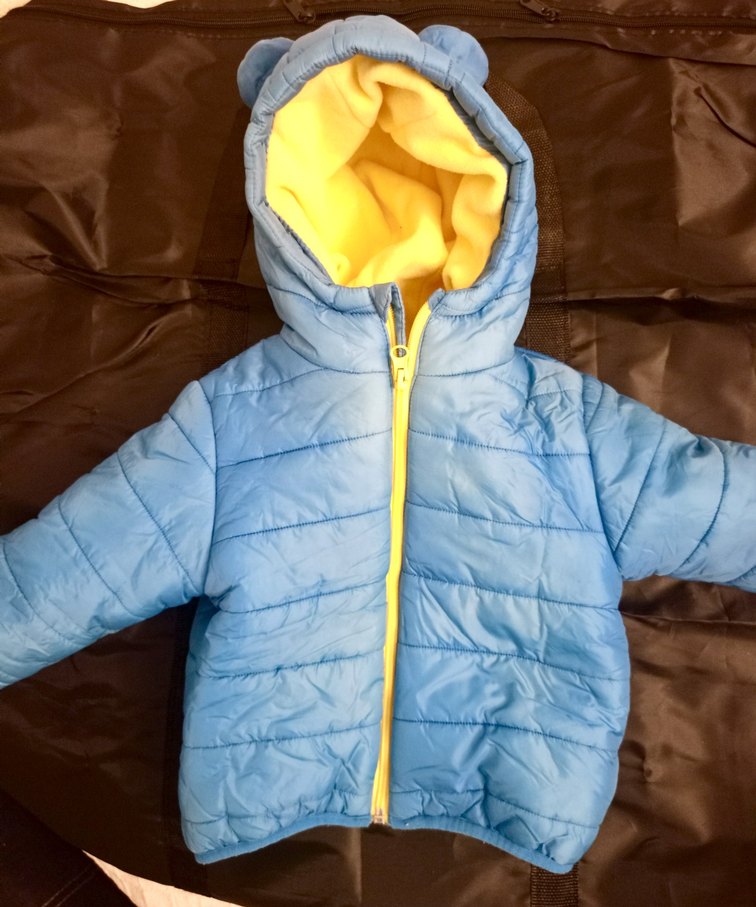 Kapüşonlu ve ayıcık kulaklı, fermuarlı mavi erkek çocuk mont. İç kısmı yumuşak sarı polar. Kusursuz.