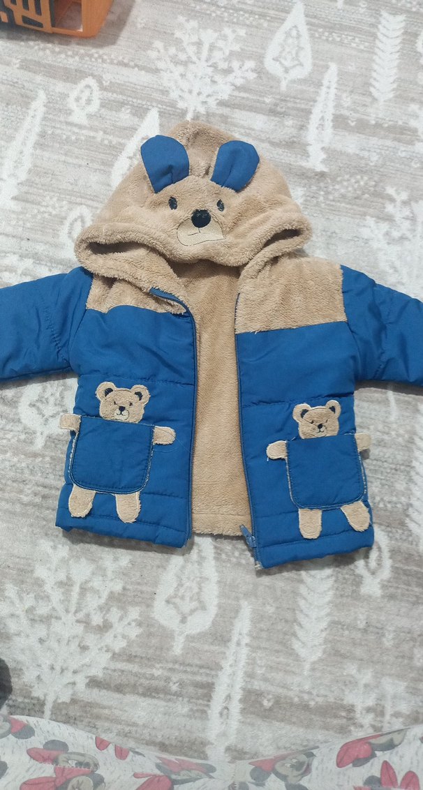 Kapüşonlu, kürklü ve nakışlı ayıcık desenli mavi renkli, fit kesim erkek çocuk montu. Rahat ve renkli streetwear tarzında.
