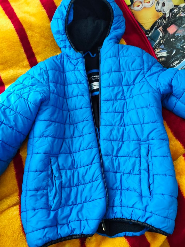 Kapüşonlu, fermuarlı ve renkli mavi tasarıma sahip, yumuşak ve sıcak kumaştan erkek çocuk montu. Sokak stili için uygun. fermuari biraz takıyor