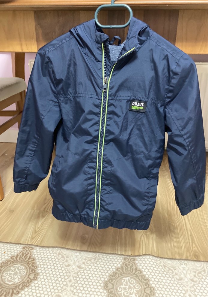 Kapüşonlu, fermuarlı erkek çocuk yağmurluk . İç kısmı yumuşak ve sıcak tutan kumaştan yapılmıştır. Günlük sokak stili için uygundur.leke yırtık yoktur.
