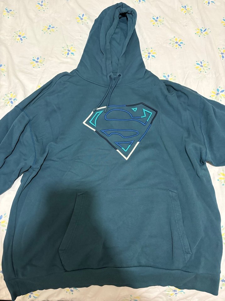 Kapüşonlu, önünde baskılı Superman logosu olan mavi erkek sweatshirt. Uzun kollu, bol kesim ve yumuşak, sıcak kumaşla konfor sağlar. Önde cep ve fermuar detaylıdır. Oversizedir sadece 3 kere giyilmiştir 2 kere yıkanmıştır herhangi bir kusuru yoktur xxl beden olup oversize kesimdir