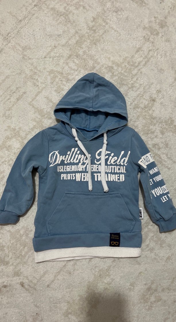 Mavi kapüşonlu erkek sweatshirt, uzun kollu ve bol kesim. Rahat sokak stili için uygun.