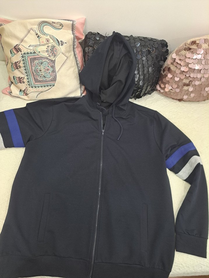 lacivert kapüşonlu sweatshirt, fermuarlı ve uzun kolludur. Kolunda mavi ve gri şeritler bulunur, rahat kesimlidir. Günlük kullanıma uygundur.