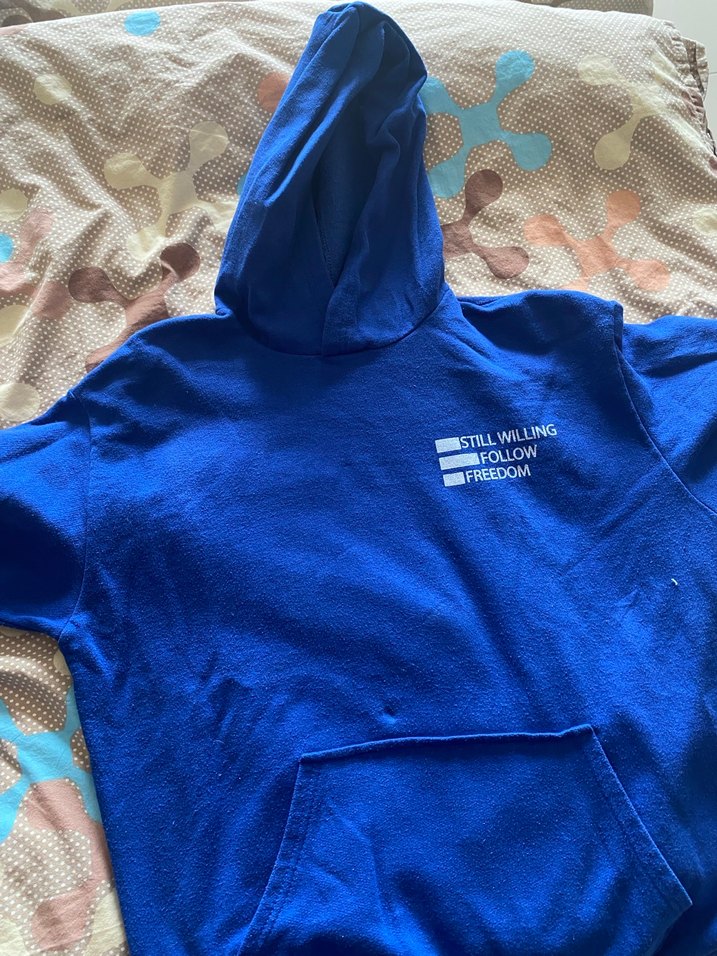 Bu koyu mavi kadın sweatshirtü kapüşonlu, uzun kollu ve bol kesimdir. "TILLWILI, EDON" yazılı baskı ve ön cep bulunur. Yumuşak ve sıcak kumaştan
